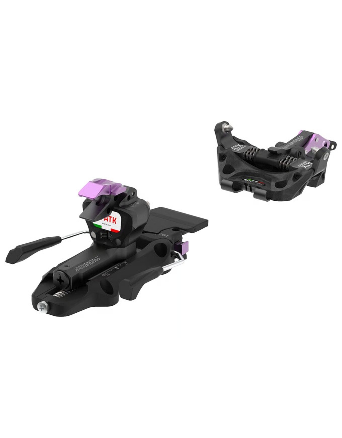 Technologies Cam Release System : Le summum des systèmes brevetés ATK® ! Il est installé sur nos talonnières pour gérer le step-in et le décrochage vertical en cas de chute. Easy Entry System : Ce système est caractérisé par une nouvelle géométrie des éléments d’accrochage de la butée avant. Elastic Responsive Syste : système qui absorbe les compressions de ski, en réduisant la pression sur le système de ski et en gardant le bon rayon de ski à n'importe quelle condition. Magneto Heel Flap : Un système d’aimants, aussi ingénieux que simple, garantit la stabilisation et la gestion des talonnettes de la talonnière. Snow Pack Proof : Un design spécial de la butée avant évite que tout dépôt de neige, glace ou autre détritus ne se forme sous le mécanisme de blocage de la butée avant.