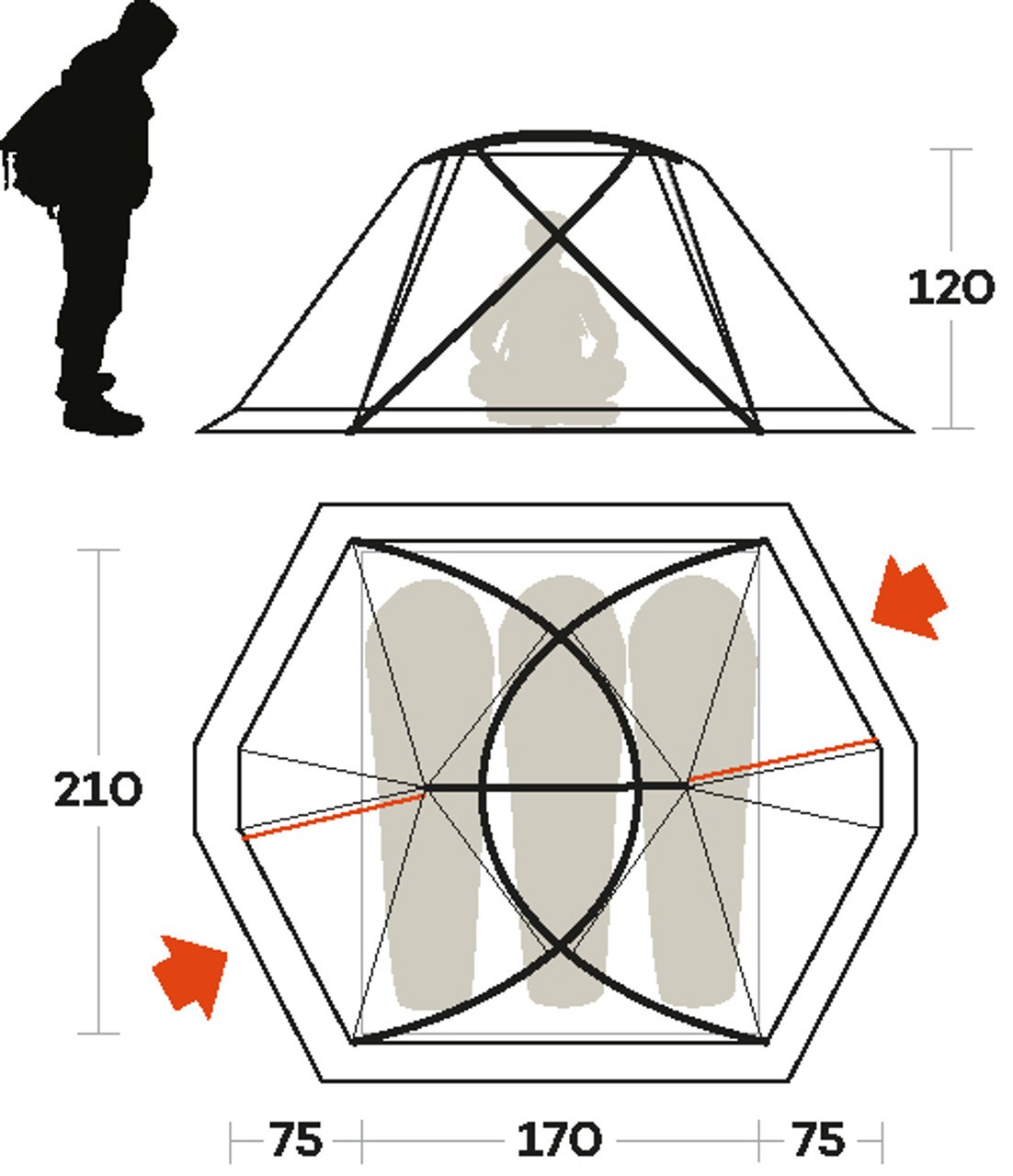 Ventilation & Accès : Deux entrées (antérieure et postérieure) protégées par des absides. Aération polyvalente : Ouïes anti-tempête et possibilité d'enrouler la toile basale pour une ventilation optimale ou de la dérouler pour une protection intégrale contre les intempéries. Portes avec moustiquaire intégrée.