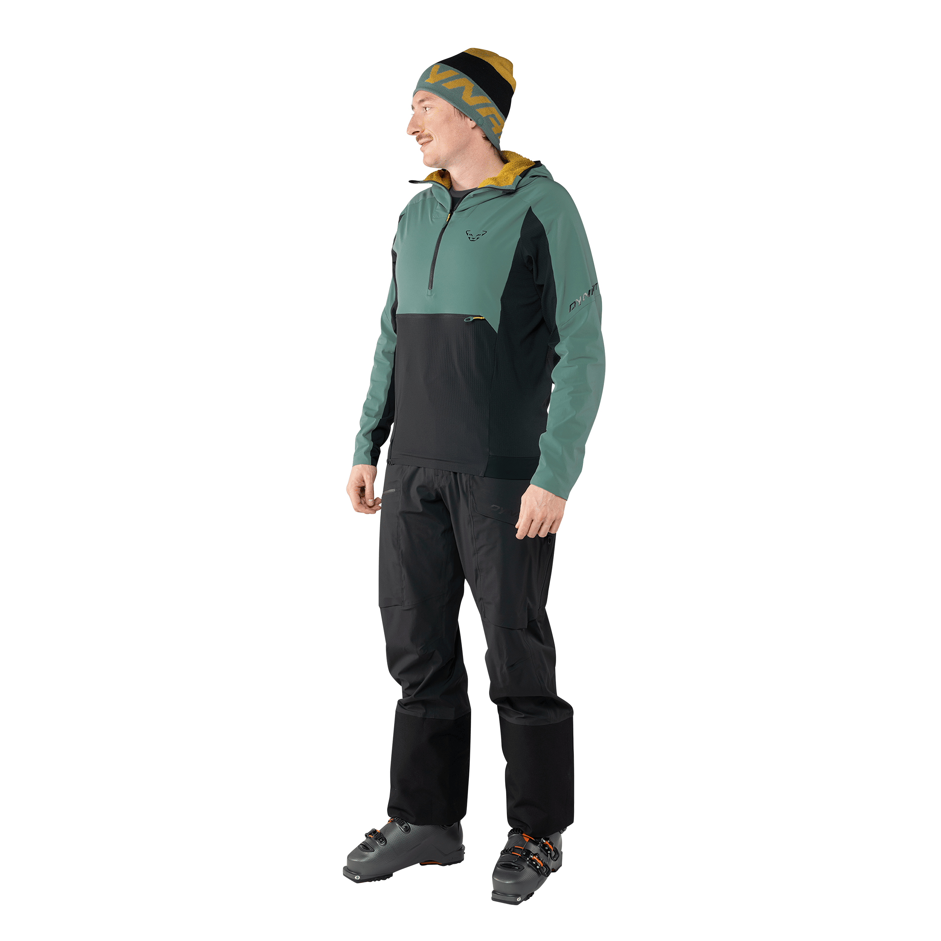 Les inserts tissés en polaire sur les flancs augmentent la liberté de mouvement au moment de rejoindre les pentes vierges, tandis que les bordures élastiques aux poignets, au bas de veste et sur la capuche maintiennent l’ensemble bien en place.